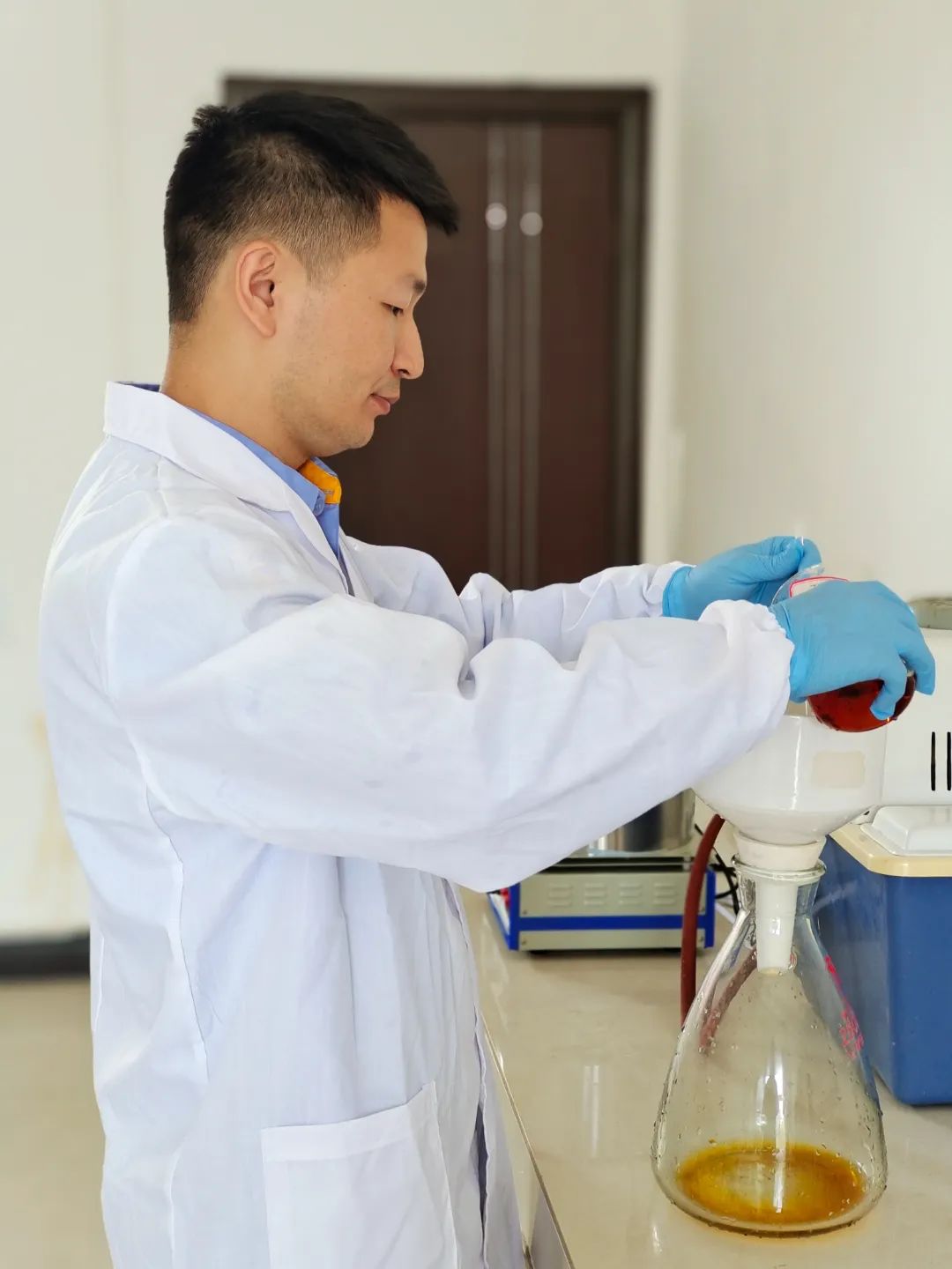 针对除杂渣含稀土高,杂质Al、Si高,回收率低等问题。企业管理部组织攻关小组,深入企业一线,夜以继日地开展除杂渣处置实验,成功自主试验研发出新工艺,得到了满足萃取要求的浸出液,且渣中稀土含量小于0.5%,稀土回收率大于90%,有效实现了稀土的回收。目前正在抓紧时间开展生产放大试验,初步结果达到预期目标。