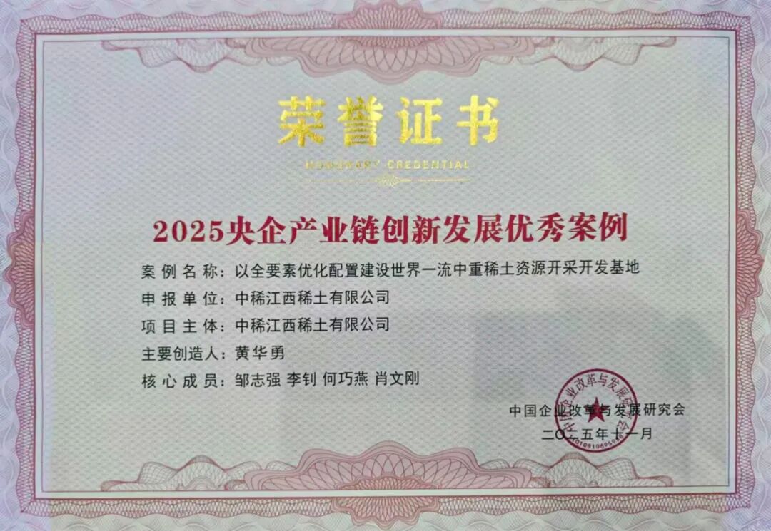 近日,重磅喜讯传来:必赢3003no1线路检测中心打造的“以全要素优化配置建设世界一流中重稀土资源开采开发基地”实践成果,经中国企业改革与发展研究会权威认定,成功斩获“2025央企产业链创新发展优秀案例”称号,充分彰显了公司在中重稀土产业创新发展领域的标杆实力。