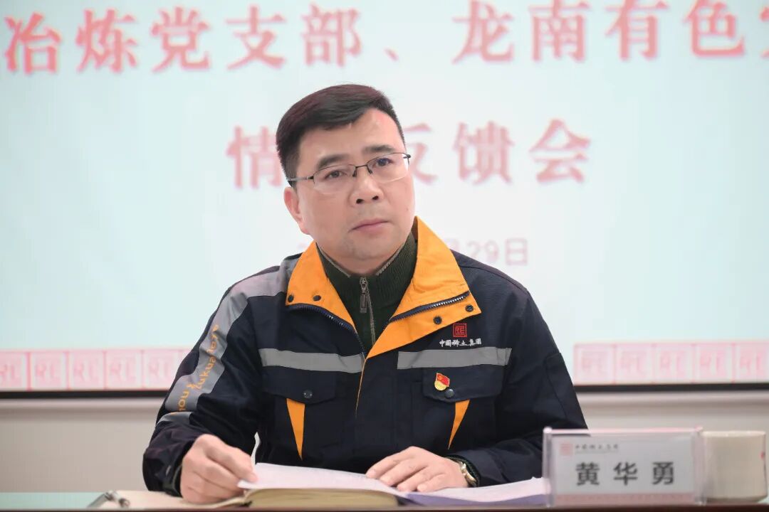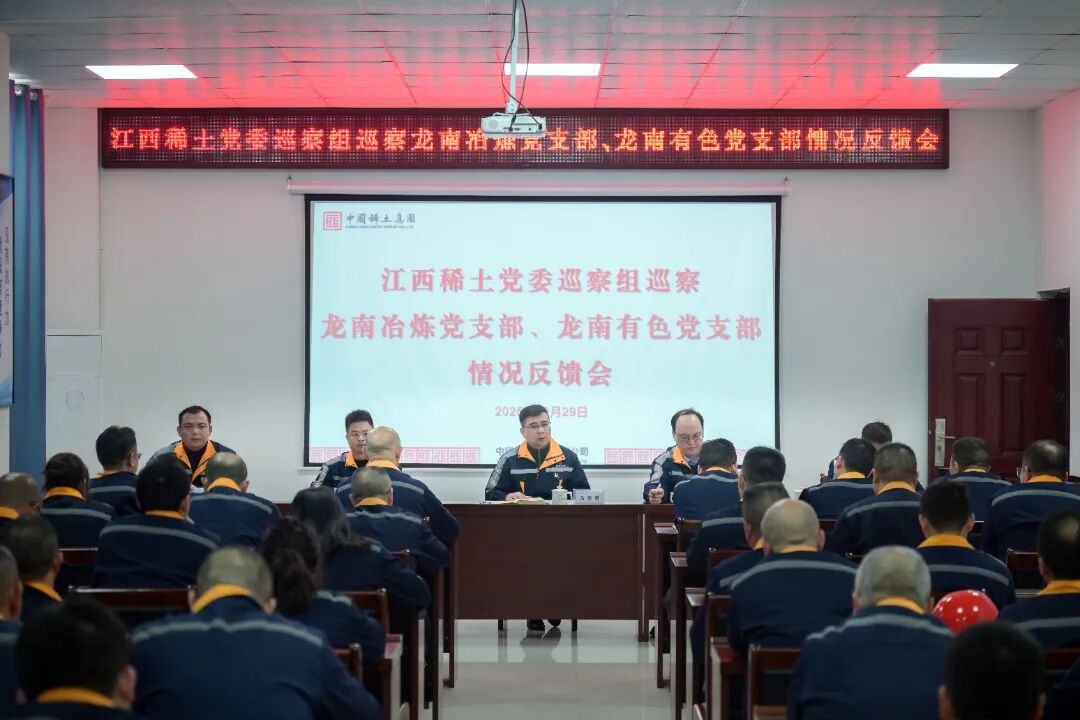 根据公司党委统一部署,12 月 29 日,公司党委巡察组巡察赣州稀土龙南冶炼分离有限公司党支部、赣州稀土(龙南)有色金属有限公司党支部(以下简称 “龙南两厂党支部”)情况反馈会召开。公司党委书记、董事长黄华勇出席会议并讲话,公司党委委员、纪委书记李程亮,党委巡察组组长曾志平、副组长周文君出席会议。龙南冶炼党支部书记、“龙南有色冶炼联合经营班子” 执行董事周平主持会议并作表态发言。